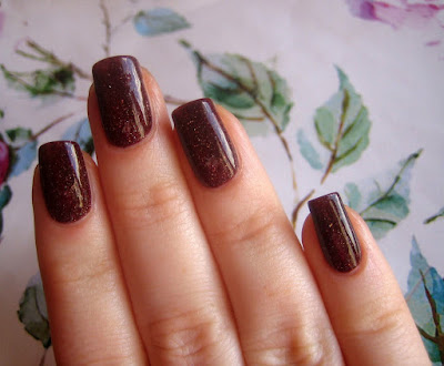 Choko (Шоколад) - темно - коричневое желе с голографическим шиммером. Помимо привычных хлопьев, там замешаны еще и тонкие голографические палочки. Палочки эти жесткие, цепляются друг за друга, часть потом все же ложится ровно, а часть так и остается топорщится на ногтях и топом их перекрыть не получится. На среднем пальце это отчетливо видно, специально не стала убирать при редактировании фотографий. Еще не понравилась стойкость - лак продержался меньше суток.